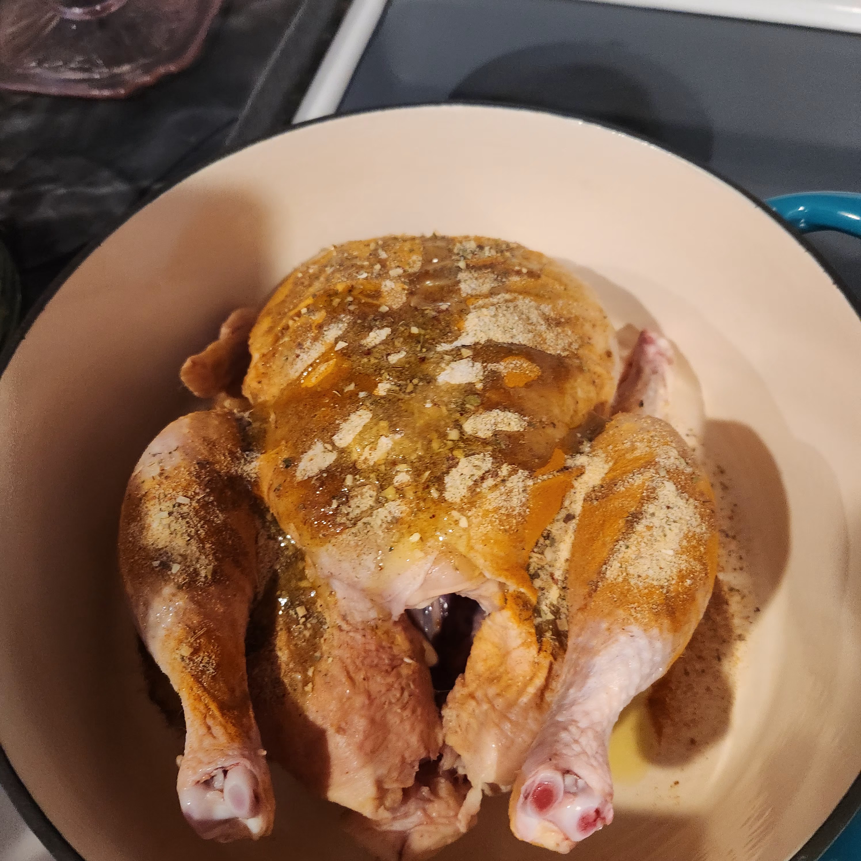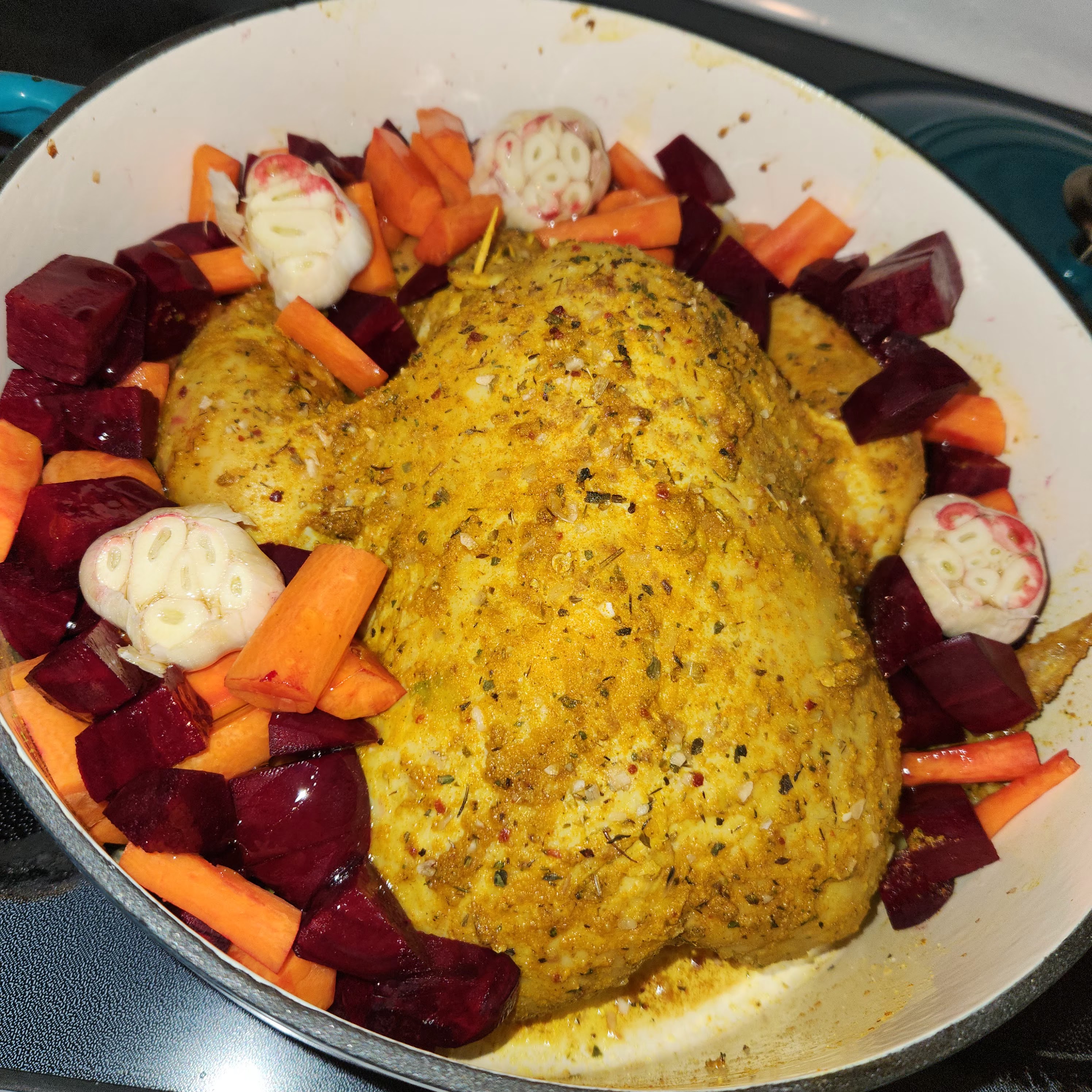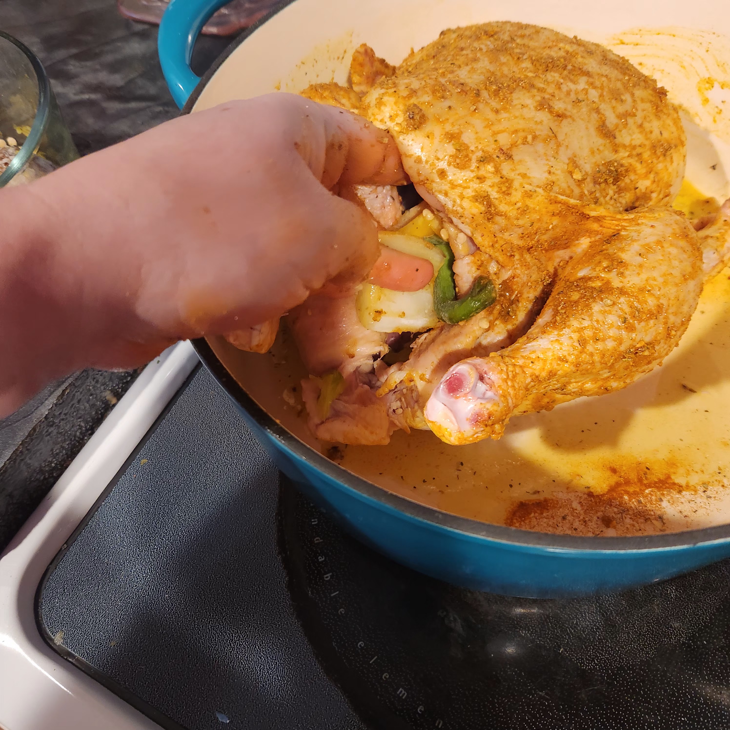 First things first! Preheat the oven to about 275degrees. Next, we’ll deal with the veggies, I like to cut my root vegetables into 1.5-2-inch pieces. I LOVE garlic, so I keep whole cloves! Time to get the dutch oven ready, drizzle a little oil in the bottom of the pot. Now it’s on to the bird! I clean out and bleach my sink… just in case but try and keep the bird from touching. Then I remove the innards and rinse the chicken! Put them in the freezer bag, don’t toss, trust me, I won’t make you eat them! Make sure all the water is able to drip out of the cavity. Put the bird in the Dutch oven breast side up, that means wings and legs are pointed more upward. Wash your hands and gather your seasonings, I’m still finding my go-to flavor profile. This last time, it turned out super good, and I used turmeric, garlic and herb, cumin, salt, and lemon pepper, then I used my hands to rub that in. I use one hand to rub, and keep one hand clean for oil and seasonings. First drizzle with olive oil and rub all over, then you can premix seasonings or sprinkle them all on and rub in. Next we’ll stuff the bird! I get out my celery and assess what’s the best choice, if its a big new head I pluck some of the scrony center pieces, if those are gone and the head is smaller ill cut the bottom off, if neither is a good option I will just take half a stalk and chunk it up. I will see if I have apple, lemon, or orange, pick one and cut that into quarters or eighths as well. This last time I use 3 apples for a desert so I put the peels and cores inside Then I use a bunch of the scraps from earlier carrots, onion, and garlic. Alternating things as I stuff them inside. If I use citrus I will usually squeeze some on the outside of the bird as well and stuff the peels. Any excess stuffing bits can be added to the freezer bag with the organ meats! Now that the chicken is all dressed, its time to add the veggies all around the bird. I like to put the potatoes down first then carrots, then onions and garlic.