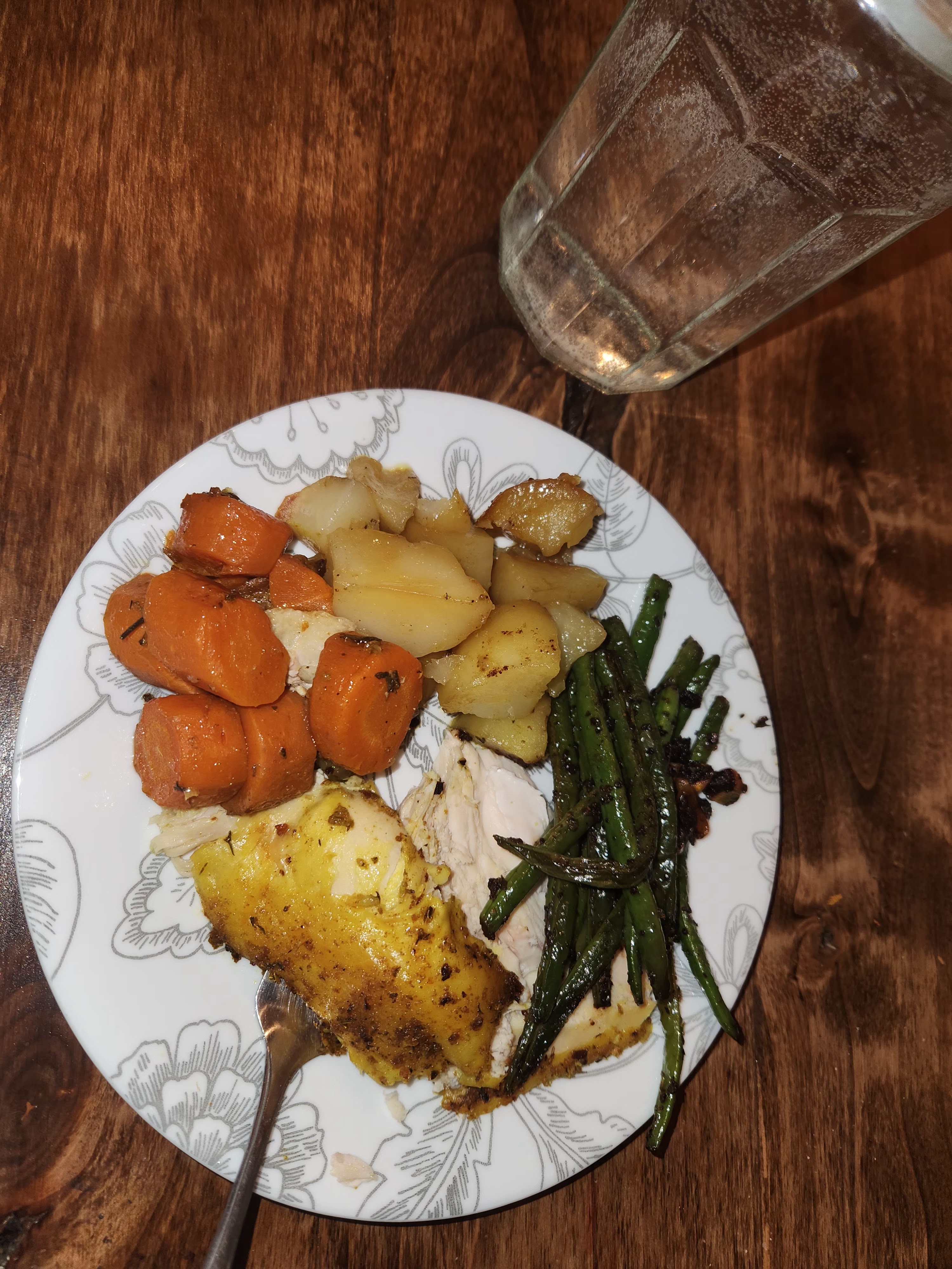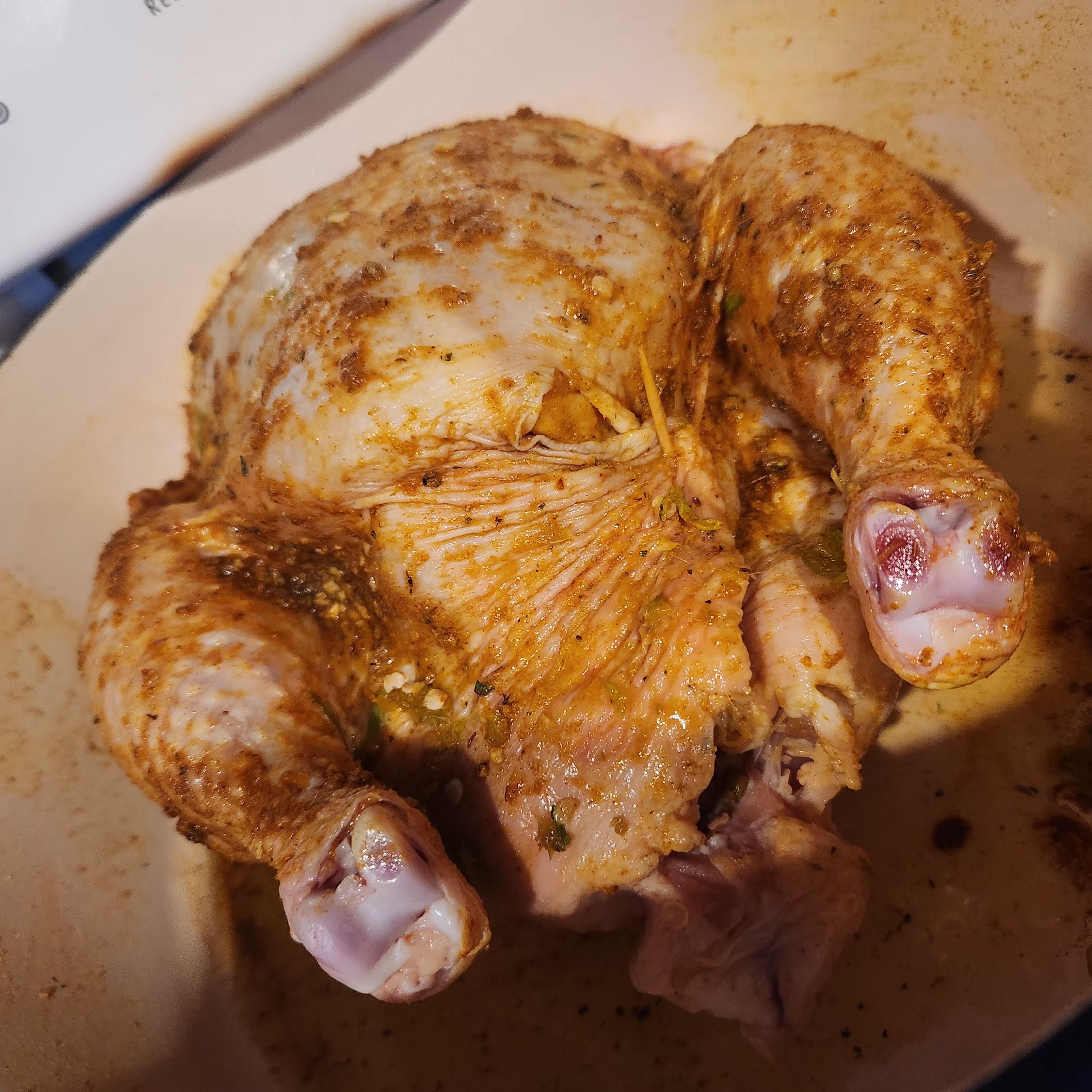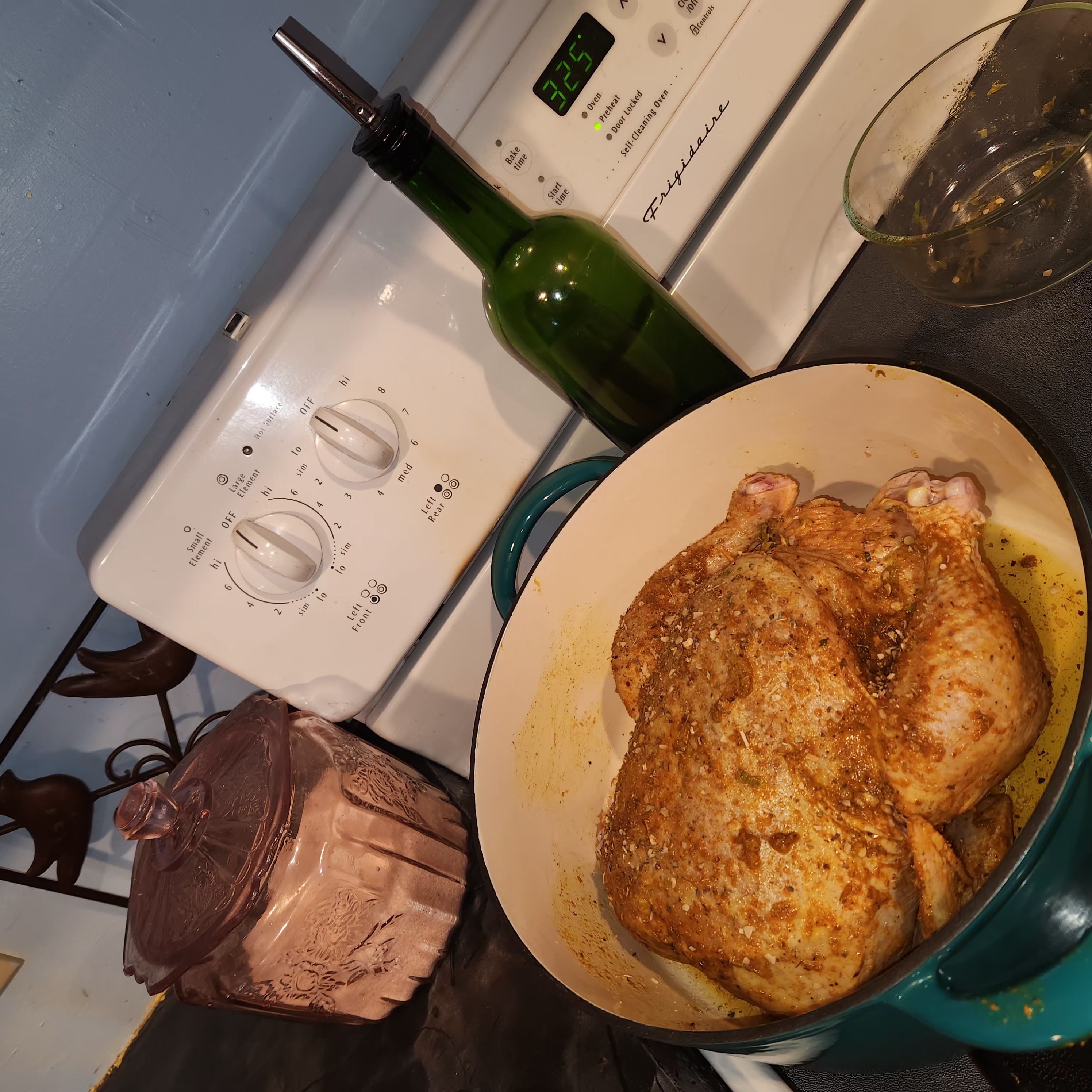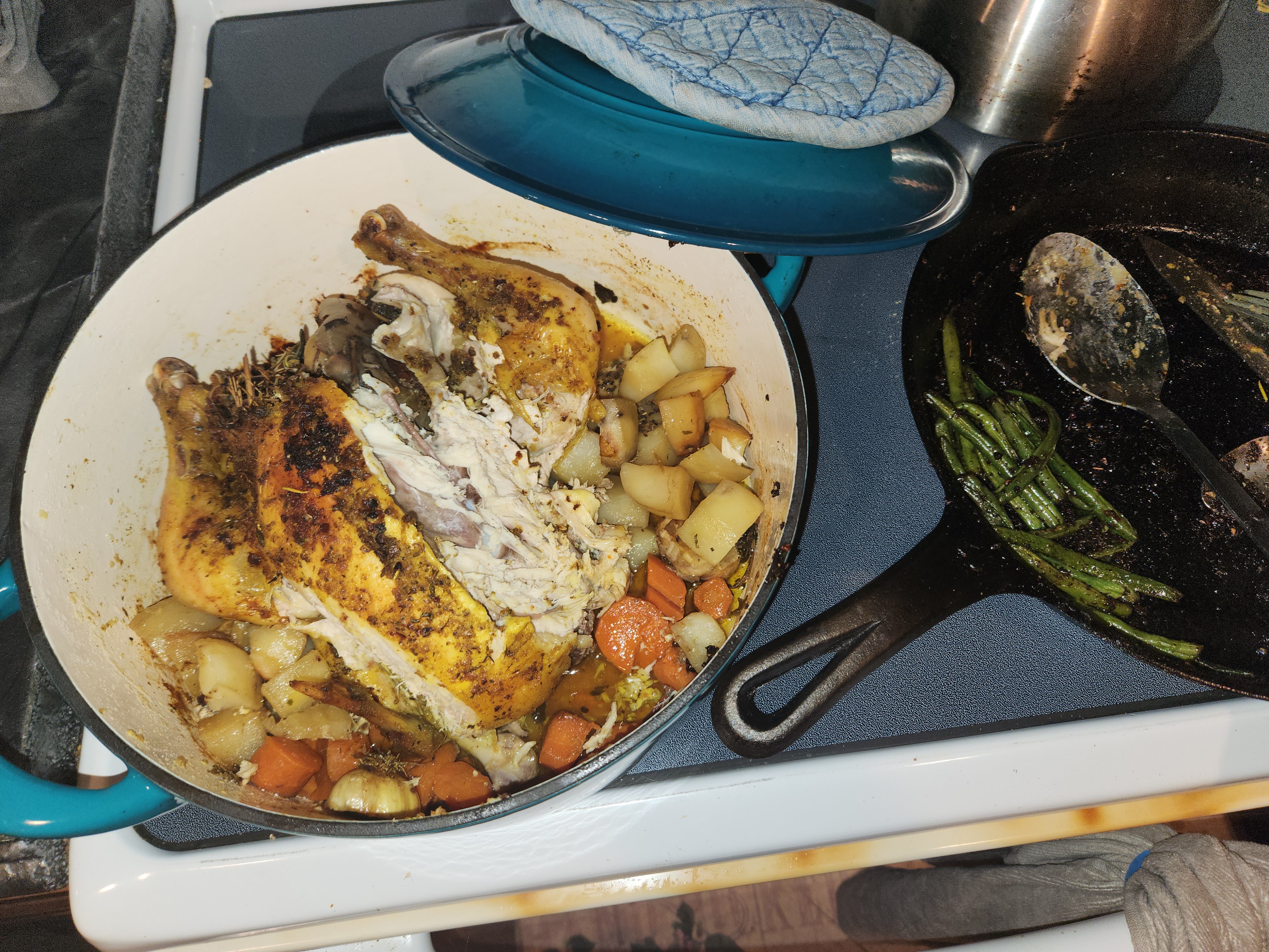 First things first! Preheat the oven to about 275degrees. Next, we’ll deal with the veggies, I like to cut my root vegetables into 1.5-2-inch pieces. I LOVE garlic, so I keep whole cloves! Time to get the dutch oven ready, drizzle a little oil in the bottom of the pot. Now it’s on to the bird! I clean out and bleach my sink… just in case but try and keep the bird from touching. Then I remove the innards and rinse the chicken! Put them in the freezer bag, don’t toss, trust me, I won’t make you eat them! Make sure all the water is able to drip out of the cavity. Put the bird in the Dutch oven breast side up, that means wings and legs are pointed more upward. Wash your hands and gather your seasonings, I’m still finding my go-to flavor profile. This last time, it turned out super good, and I used turmeric, garlic and herb, cumin, salt, and lemon pepper, then I used my hands to rub that in. I use one hand to rub, and keep one hand clean for oil and seasonings. First drizzle with olive oil and rub all over, then you can premix seasonings or sprinkle them all on and rub in. Next we’ll stuff the bird! I get out my celery and assess what’s the best choice, if its a big new head I pluck some of the scrony center pieces, if those are gone and the head is smaller ill cut the bottom off, if neither is a good option I will just take half a stalk and chunk it up. I will see if I have apple, lemon, or orange, pick one and cut that into quarters or eighths as well. This last time I use 3 apples for a desert so I put the peels and cores inside Then I use a bunch of the scraps from earlier carrots, onion, and garlic. Alternating things as I stuff them inside. If I use citrus I will usually squeeze some on the outside of the bird as well and stuff the peels. Any excess stuffing bits can be added to the freezer bag with the organ meats! Now that the chicken is all dressed, its time to add the veggies all around the bird. I like to put the potatoes down first then carrots, then onions and garlic.