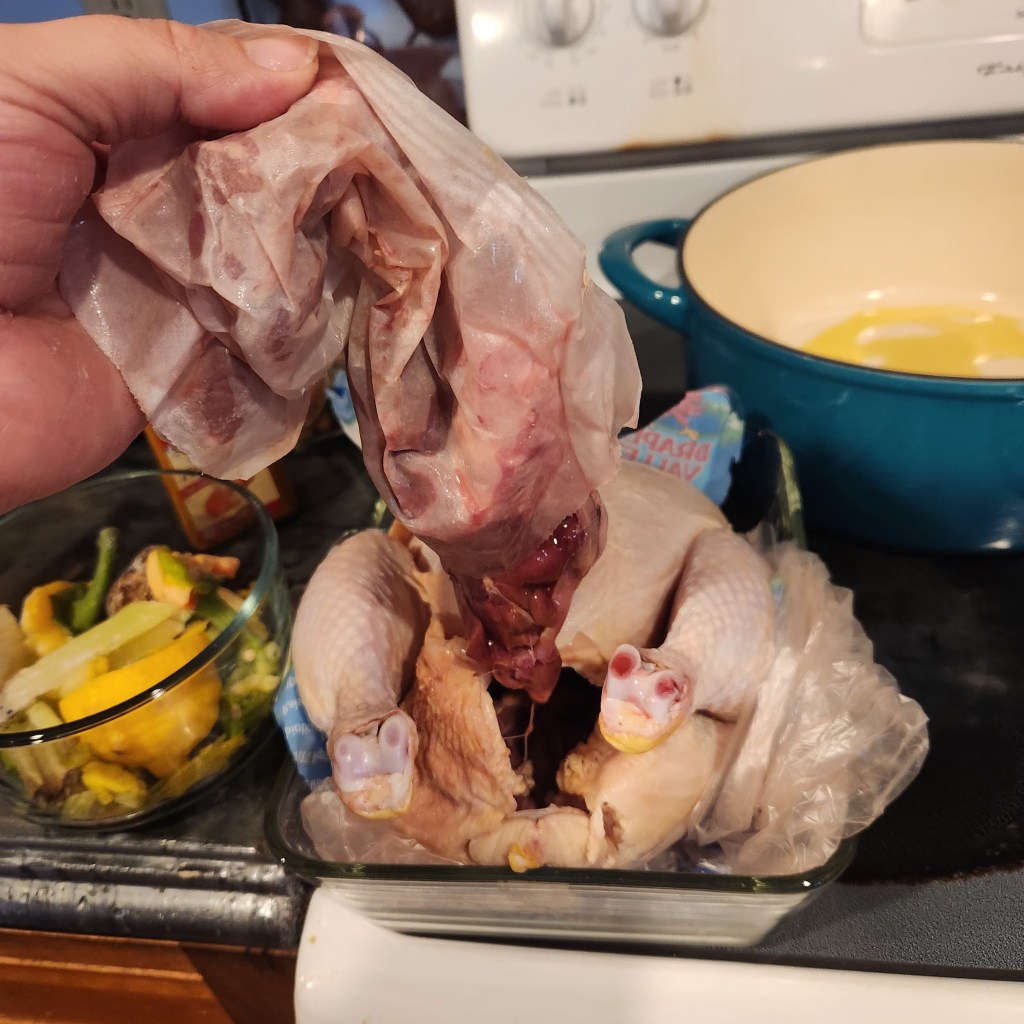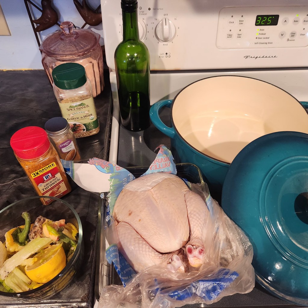 There was a time I was intimidated by a whole raw chicken! I had made a couple over the years and a couple of turkeys as well. But it felt like a lot of work, plus there was the carcass I had to keep from the dogs. As far as I’m concerned, one can’t just slather it in bbq sauce or deep fry. Furthermore, why would I think of a whole chicken when I wanted to shred it for tacos, pasta, or green enchiladas? That is until a lovely youtuber demonstrated how wonderful using a full chicken can be! And it’s very cost-effective! With one bird you can get like 3 nights of dinner plus 3 quarts or more of broth! Plus, it works with my goal of eating more whole foods. and if you bought the individual parts of the chicken they would cost more per pound! I would assume this is because the butchers had less work to do to process the bird!