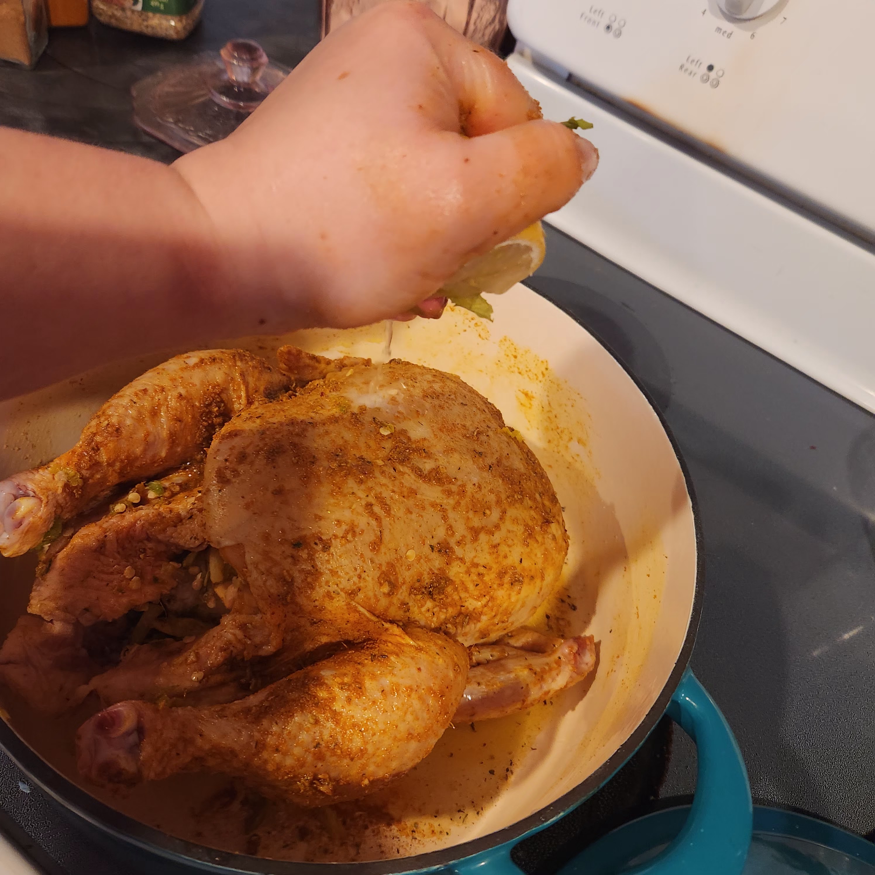 Once all of that is done, put the lid on, and bake for about 4 hours at 275 degrees. The chicken is done when you are able to cut and all juices are clear, and all meat is white! It’s pretty cheap to invest in a meat thermometer, I think I got one of the dial kinds at Walmart for 5-10 dollars, for me it’s worth it to know the food is safe. If you have a meat thermometer stick it in the thickest part of the thigh, near the bone but not touching the bone, the temp should read 170 degrees. I get mine in by nap time, 1pm and I leave it in the oven till my husband gets home around 6pm. It is suggested to typically let it rest for 15 to 30 minutes before cutting. If the day was not letting me get it in before nap and I got it later on you can cook at 475 degrees for 2 hours.